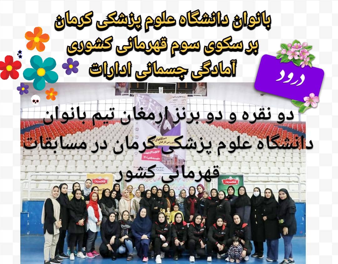 تیم آمادگی جسمانی بانوان دانشگاه علوم پزشکی کرمان در مسابقات قهرمانی ادارات کشور بر سکوی سوم ایستاد و مقتدرانه با دو مدال نقره و دو مدال برنز در بخش انفرادی و رده های سنی مختلف حائز مقام سوم کشوری در سال 1401 شدند.
